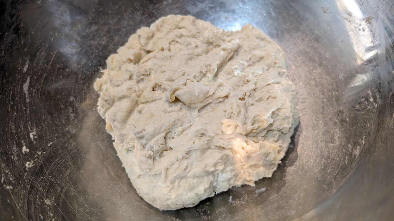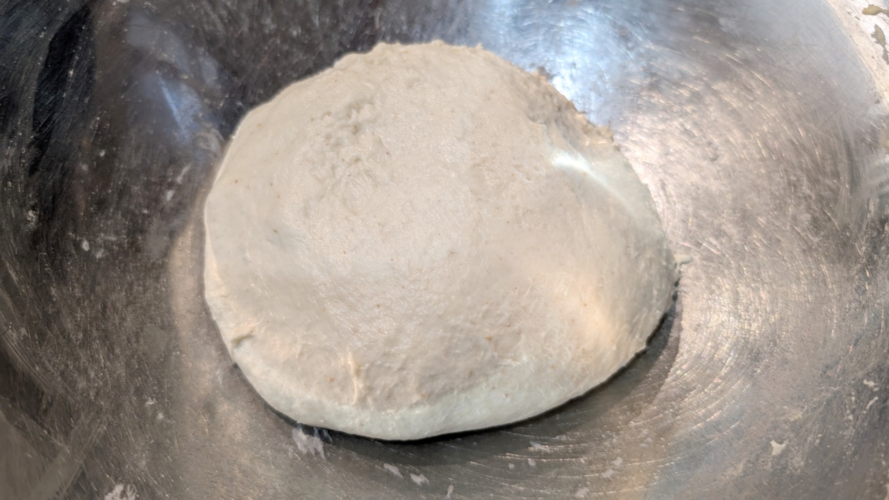 当日使用しない場合は1.5時間熟成させた後冷蔵庫に入れます。8~12時間後に使用できる状態になります。 - 材料を全て計量し、塩以外の全ての材料をボウルに入れて粉っぽさがなくなるまで混ぜ、30分間オートリーズを行います。