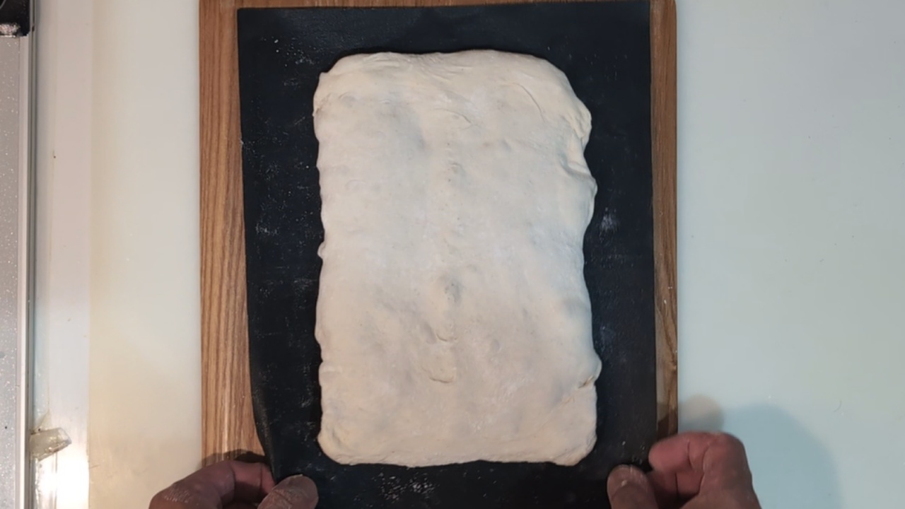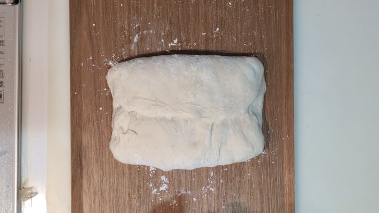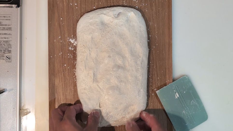 - 生地を成形します。生地を容器から出し、両端から中心に向けて折りたたみ2段重ねにします。大きなガスはやさしく抜いておきます。成形が終わったら閉じ目を下にしてベーキングシートに乗せます