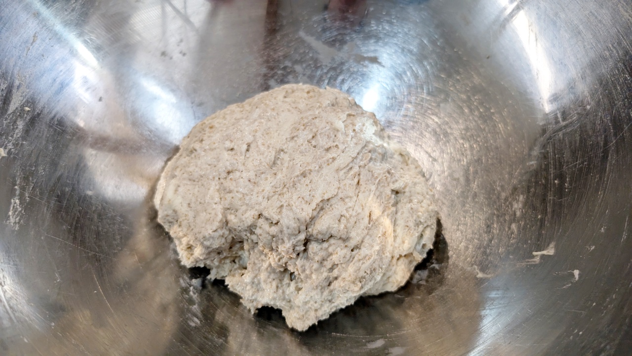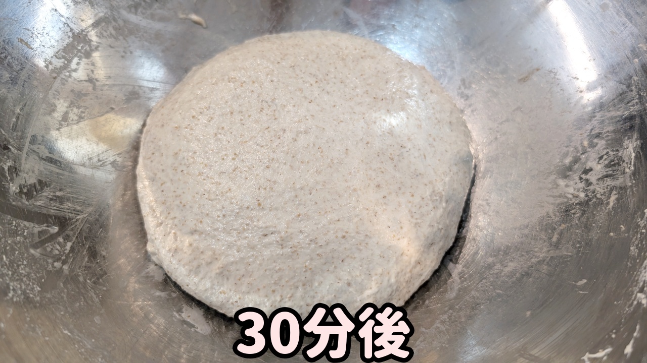 - 粉っぽさがなくなるまで混ぜ、30分間オートリーズを行います。