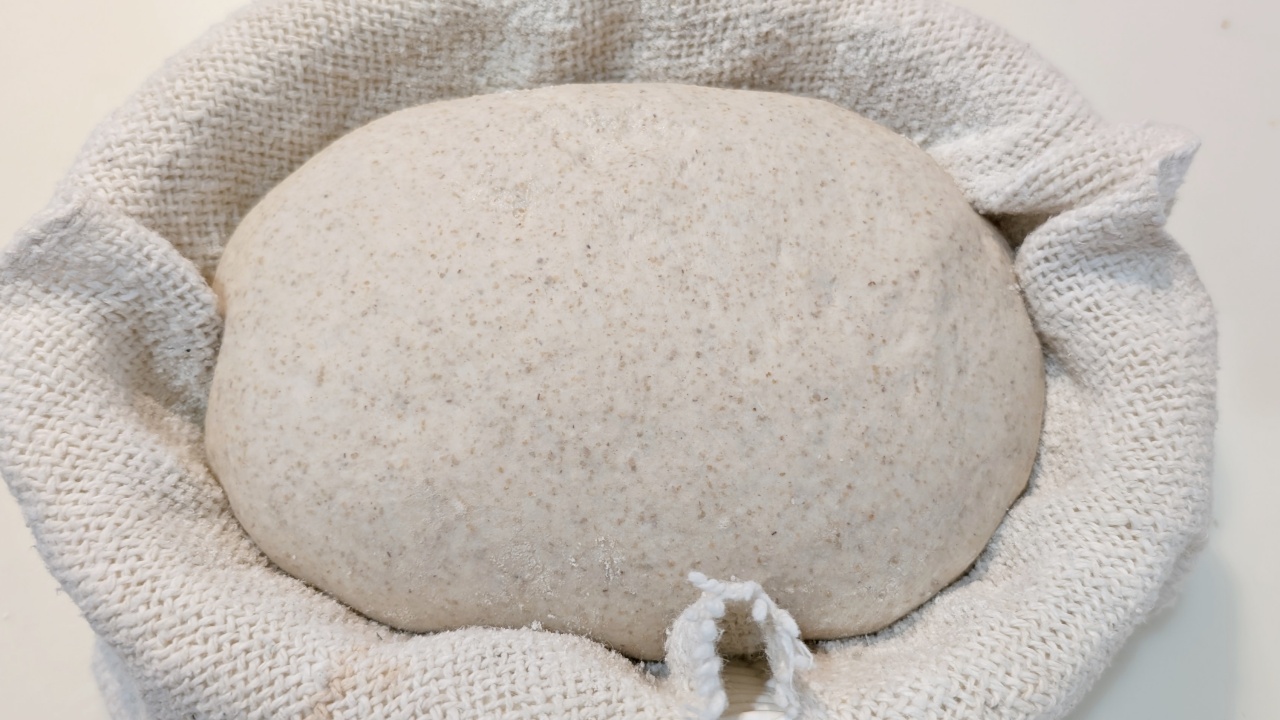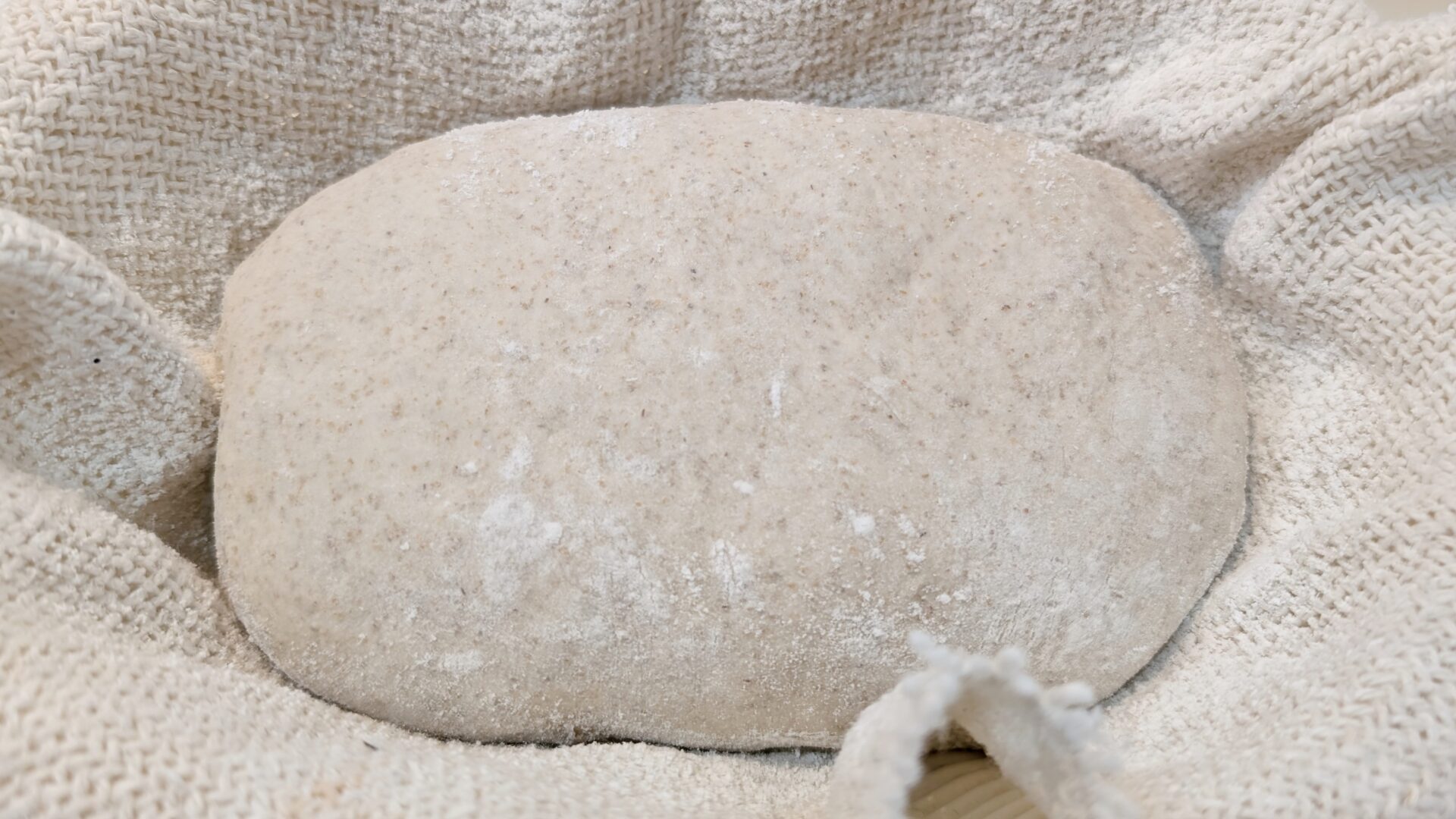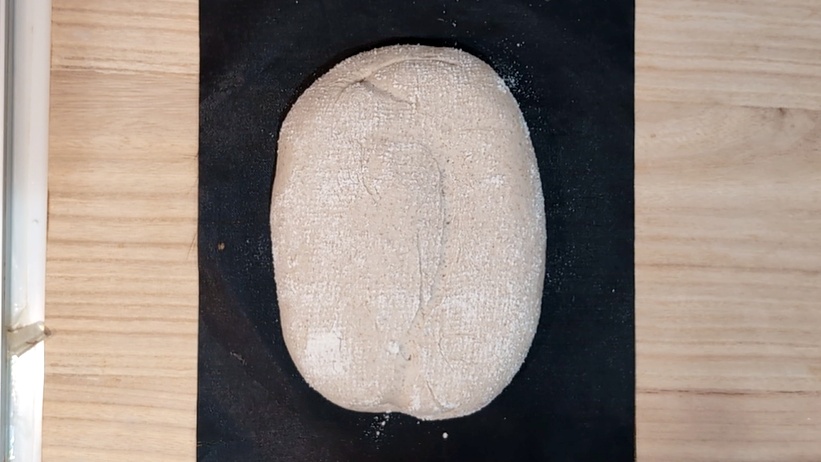 - 発酵かごに薄手の布を敷き、粉を振りかけます。閉じ目に粉をつけ、閉じ目を下にして発酵かごに入れます。