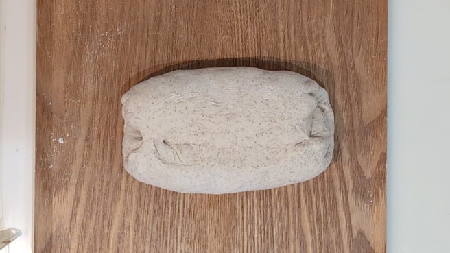 - 生地を成形します。生地に溜まったガスを手のひらを使って優しく抜き、折りたたんで楕円形に整えます。閉じ目は完全には閉じません。