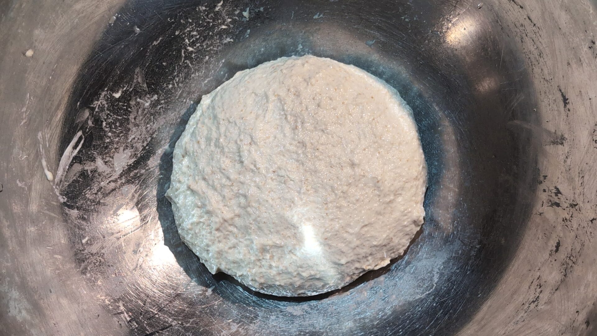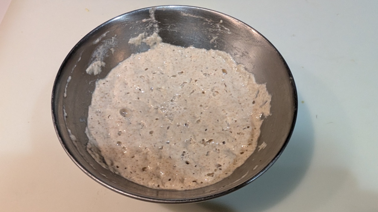 - サワー種の材料を全て計量し、ボウルに入れて混ぜ合わせます。20~22℃で12~16時間熟成させます。