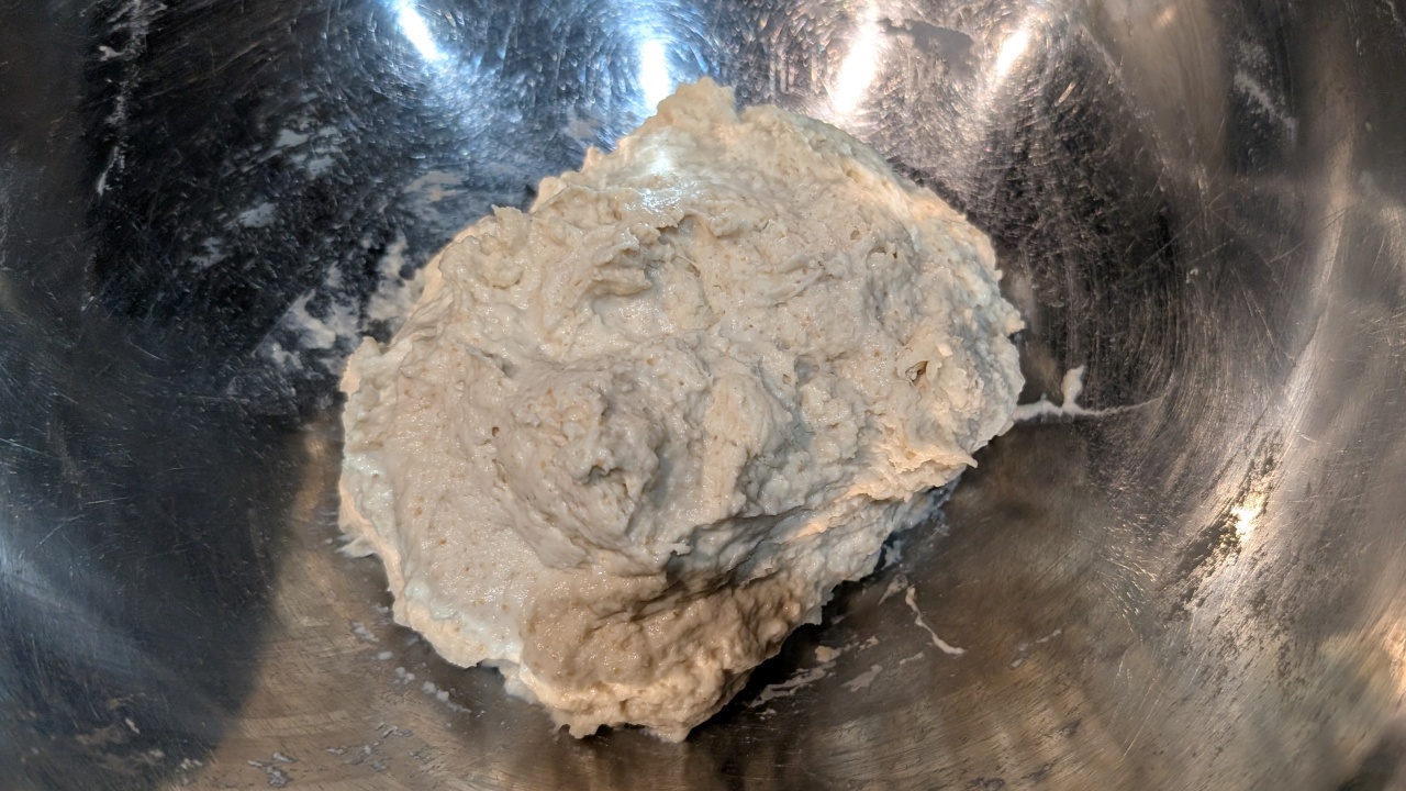 - 粉っぽさがなくなるまで混ぜ、30分間オートリーズを行います。