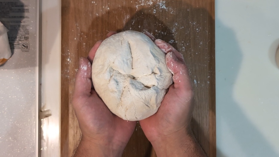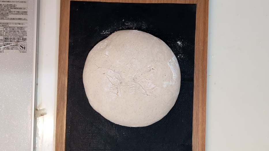 - 生地を成形します。生地に溜まったガスを手のひらを使って優しく抜き、中心に向けて端から折りたたみ、丸く成形します。閉じ目は完全には閉じません(表面にカットを入れる場合は閉じ目はしっかり閉じます)。