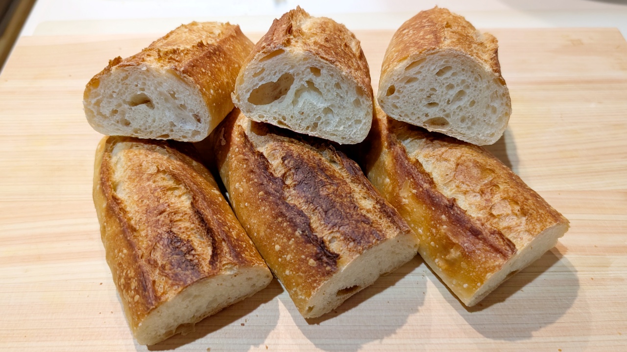 でき上ったバゲットはしっかりこねたバゲットと比べるとややボリュームは劣りますが、旨味や風味、香ばしさは十分にあり、作業の手軽さを考えると十分許容できる質だと私は思います。